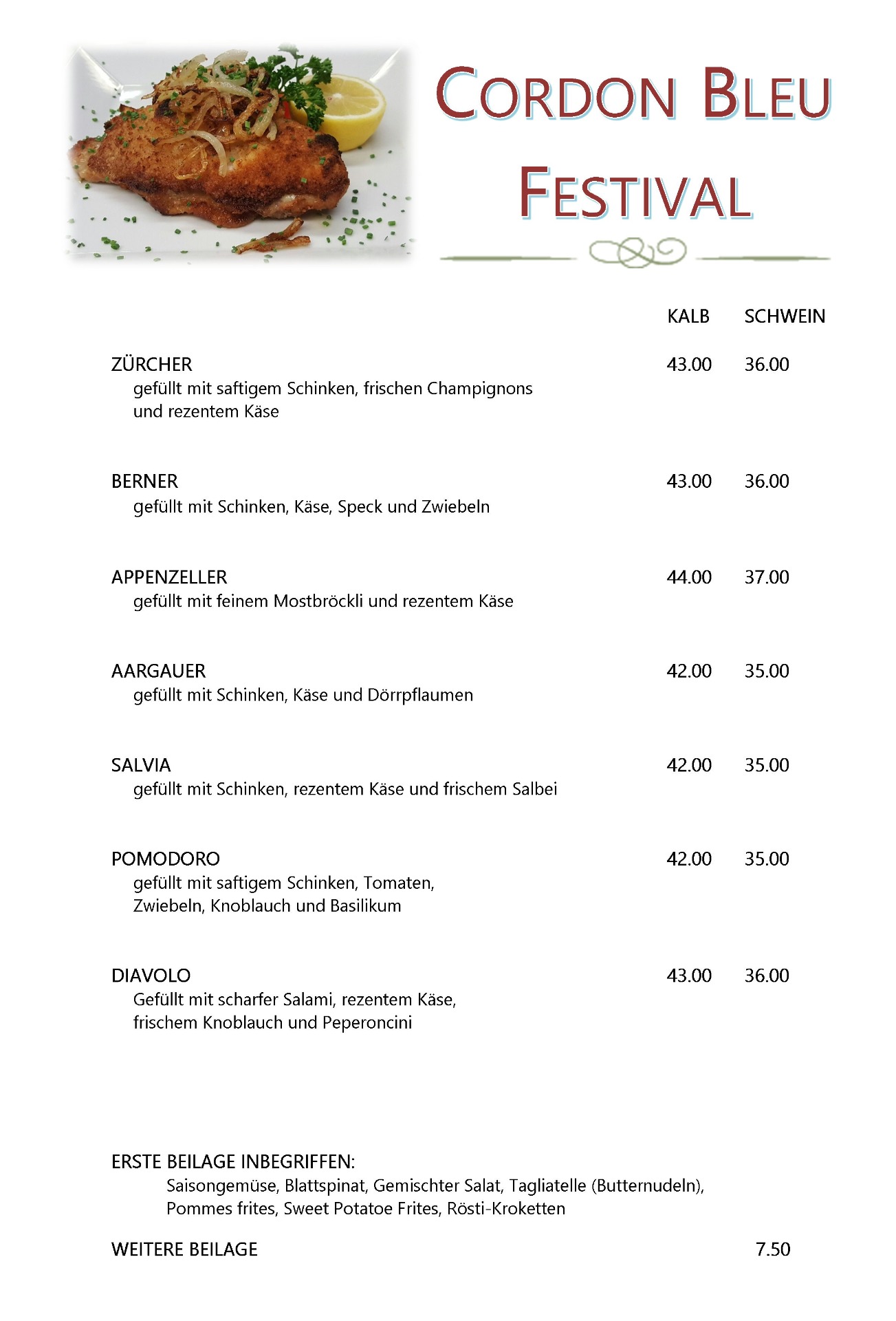 Unsere frisch zubereiteten Cordon Bleus sind unsere absolute Spezialität. Auf unserer Karte finden Sie alle 2 Wochen neue Kreationen.