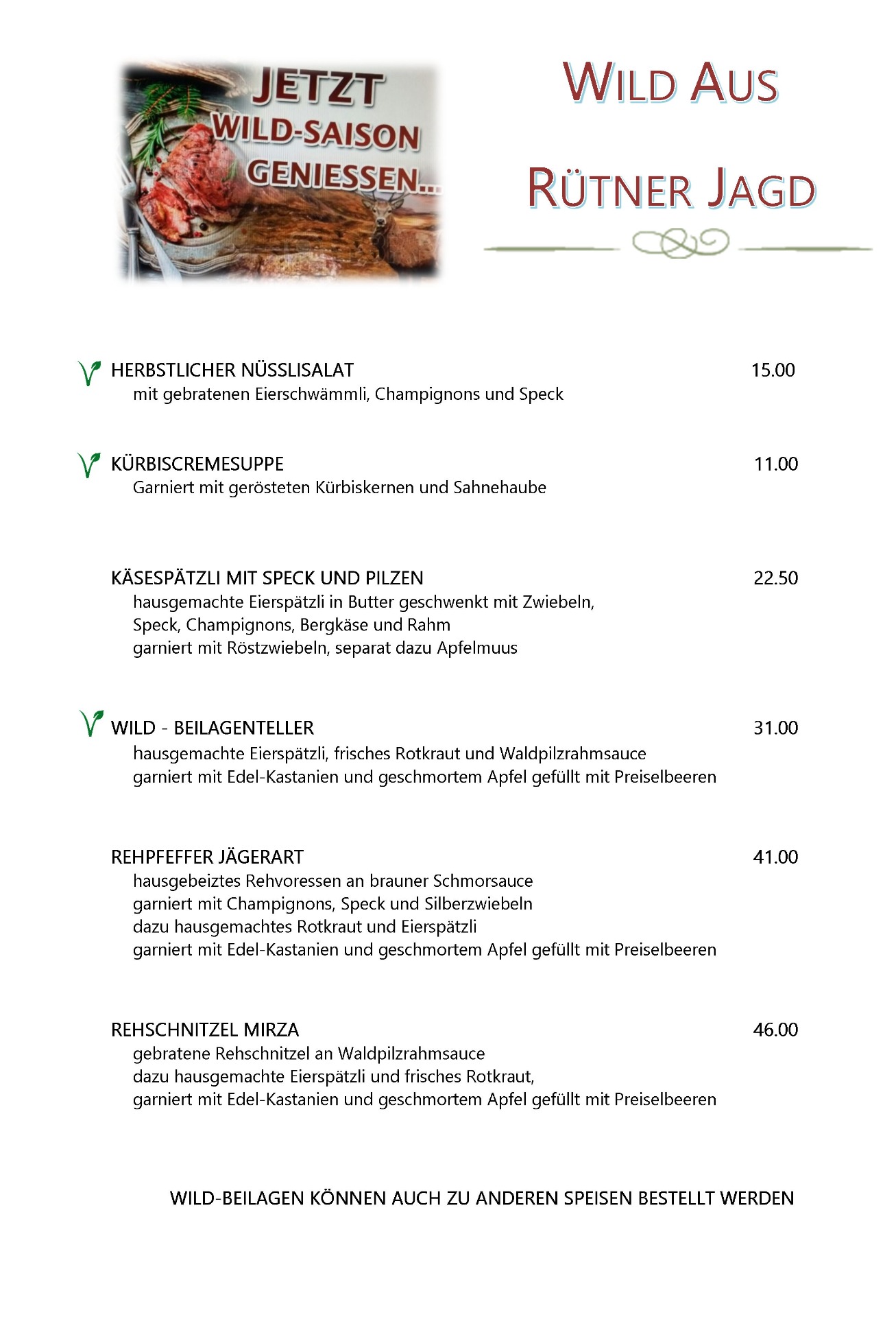 Genießen Sie exquisites Wild aus der Rütner Jagd – von Rehpfeffer Jägerart bis zum Rehschnitzel Mirza, begleitet von hausgemachten Eierspätzli, Rotkraut und Waldpilzrahmsauce. Saisonale Spezialitäten wie herbstlicher Nüsslisalat, Kürbiscremesuppe, Ravioli mit Eierschwämmli, Spaghetti Cacciatore oder den Rehrücken vom heissen Stein runden das Angebot ab.